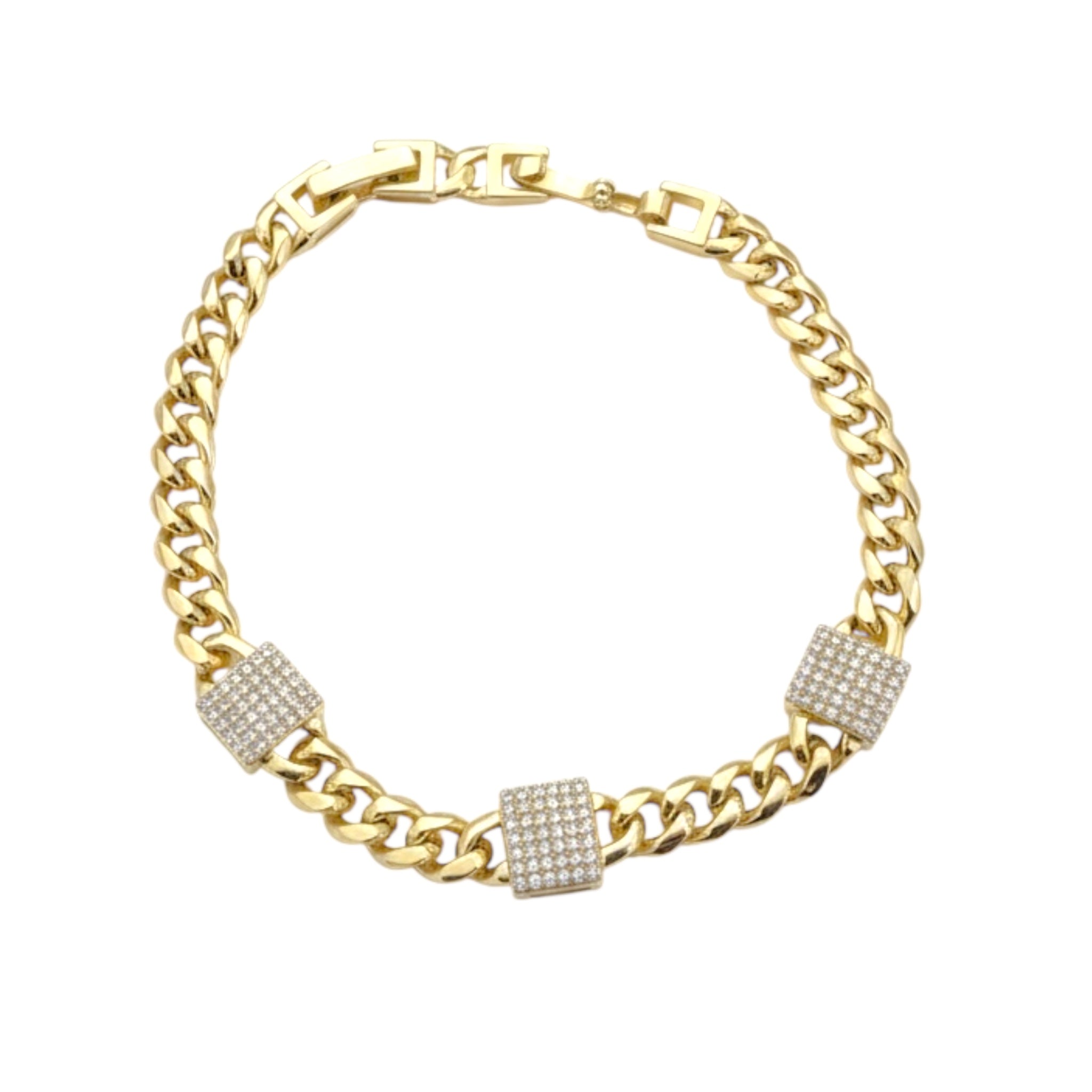 Conçu avec une finition dorée polie pour un éclat miroir, il se distingue par ses trois inserts carrés majestueux, entièrement pavés de cristaux scintillants. Ces détails captent la lumière à chaque mouvement, offrant un contraste saisissant avec les maillons massifs.