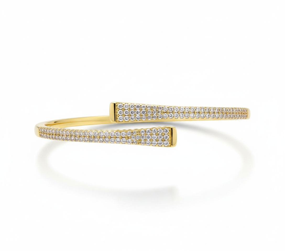 L'équilibre parfait entre force et délicatesse. Ce bracelet jonc ouvert en acier inoxydable se distingue par son double pavage de brimants scintillants. Une pièce de haute joaillerie moderne à porter seule ou en accumulation.