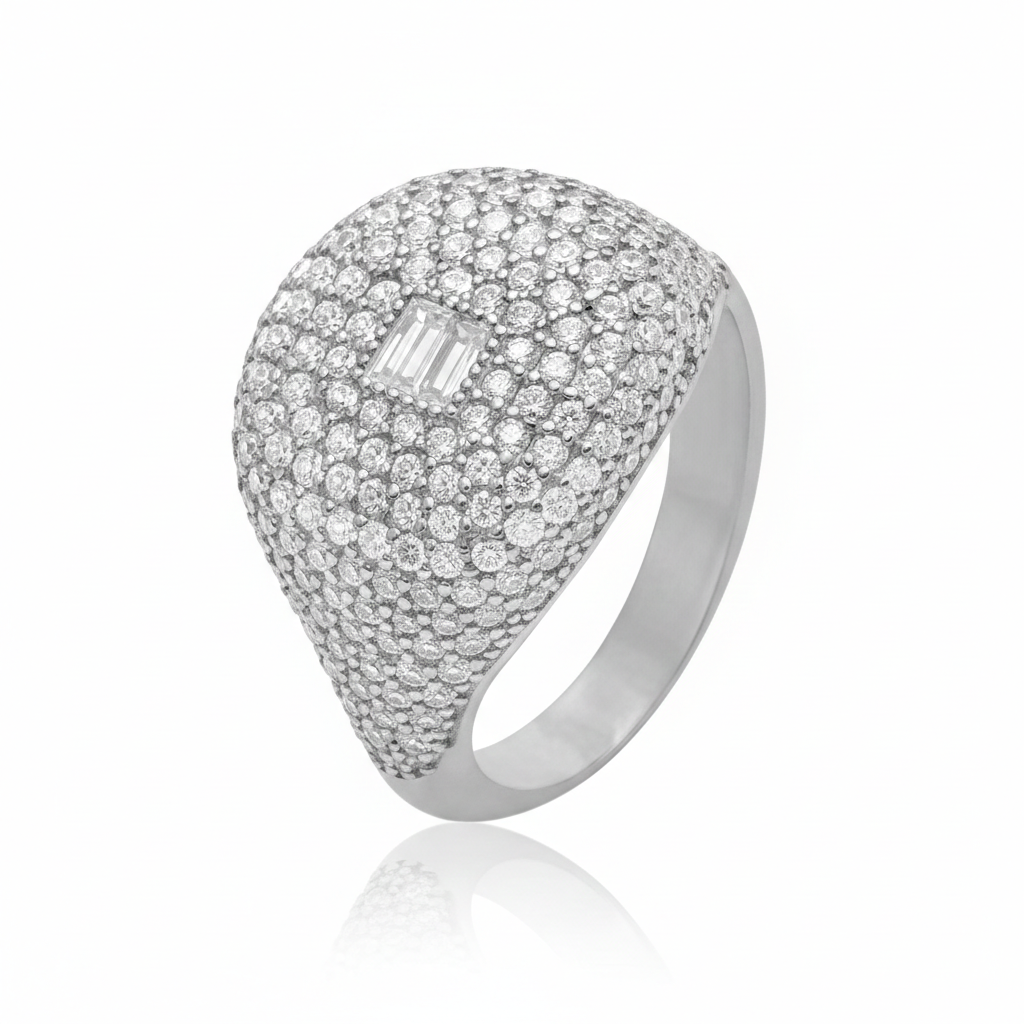 Forgée en Argent 925 massif, sa silhouette bombée est entièrement recouverte d'un pavage de zircons méticuleusement sertis. Au centre, une pierre taille émeraude vient couronner l'ensemble, créant un point focal d'une brillance absolue. C’est la pièce idéale pour celles qui veulent allier force et féminité.