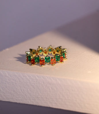 Ajoutez une touche de fraîcheur et de gaieté à votre style avec la bague Orange and Green Cocktail. Cette pièce unique en plaqué or se distingue par ses pierres colorées : un éclat d'orange vif et un vert profond qui se complètent harmonieusement. Un bijou audacieux et raffiné, parfait pour illuminer vos looks du quotidien comme vos tenues plus habillées.